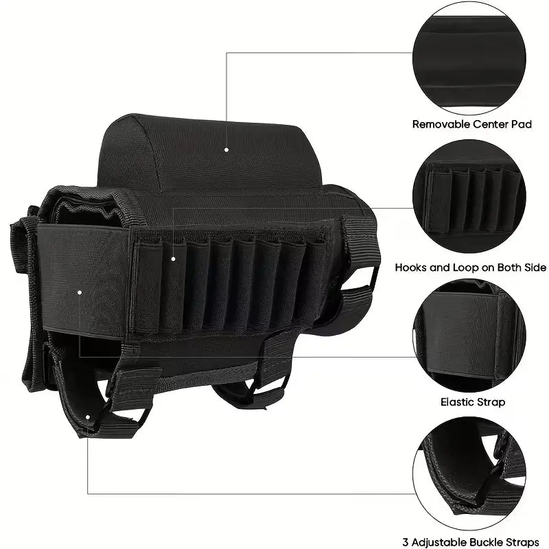 Подходящ е за различни модели ловни пушки и карабини, като осигурява по-добра позиция на бузата и по-добър контрол при стрелба. Гнездата за патрони позволяват винаги да имаш необходимите боеприпаси под ръка, без да губиш време в презареждане от джобове или чанти.