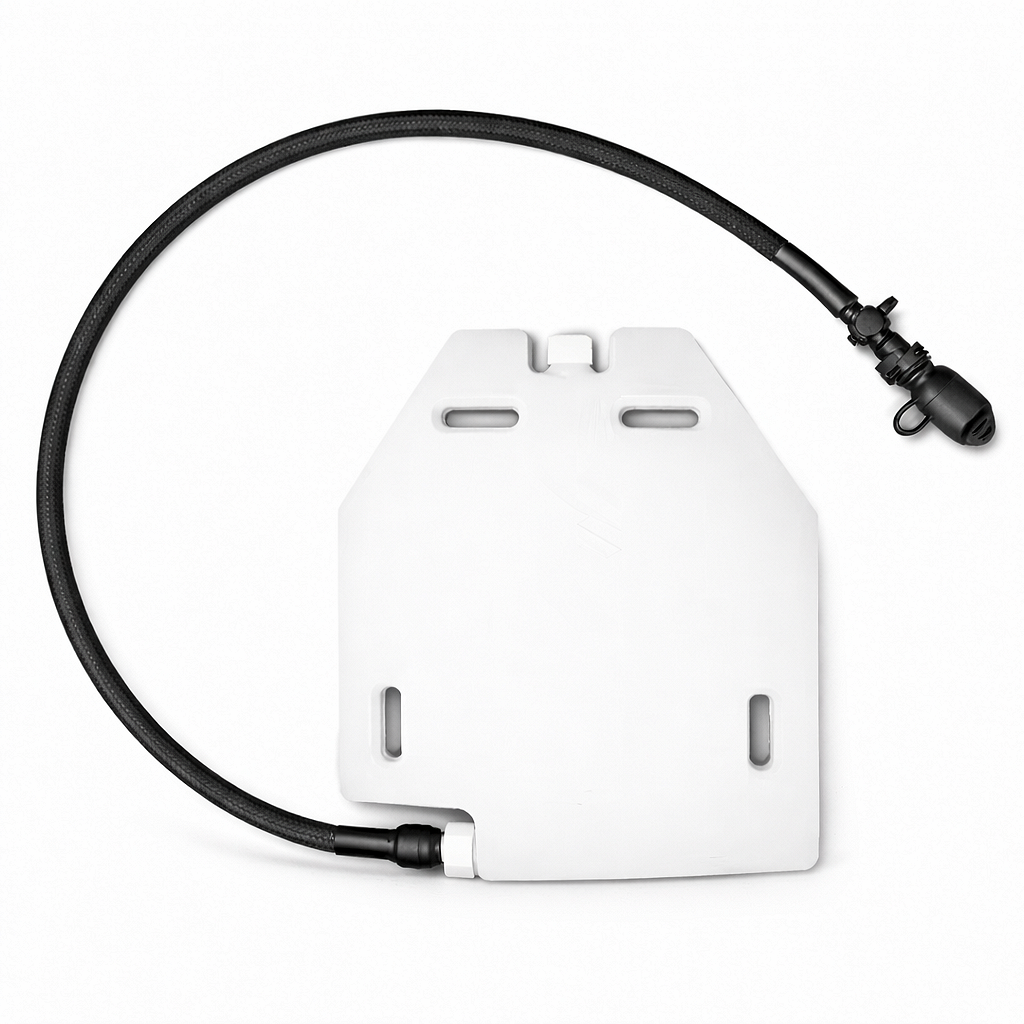 Резервоарът има плоска форма, подобна на plate, което позволява стабилно и удобно позициониране във вътрешния джоб на жилетката. Към него е свързан маркуч с клапан за пиене, който може лесно да се изведе през рамото на жилетката за бърз достъп до вода по време на движение.